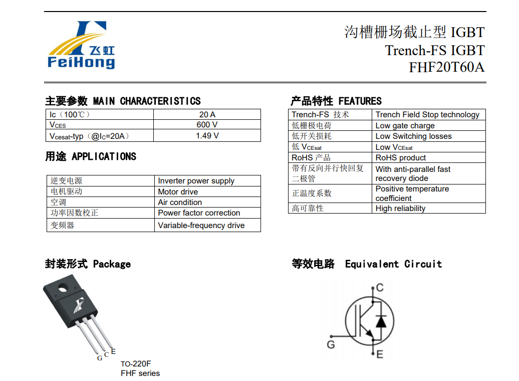 目前飞虹半导体的FHF20T60A型号IGBT产品参数特点为:
